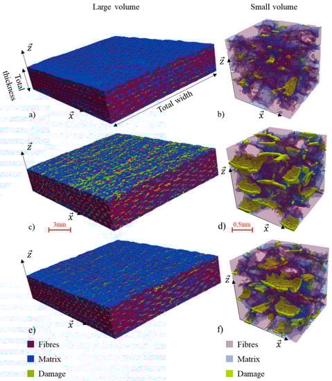 To analyze the damage mechanisms during the in-situ tensile test, the tomographic images recorded at each state were segmented, as described in Section 2.5. It allowed us to visualize and quantify the damage volume in the specimen. Figure 6 shows the results obtained after the 3D segmentations for the in-situ tested sample before loading (Figure 6a), loaded at 80% of the ultimate stress (Figure 6b), and unloaded (Figure 6c). Two different magnifications are presented. The large volume is constituted of more than 500 million voxels. It covers the total width and the total thickness of the tested specimen and allows for the study of the distribution of the damage in the sample. The small volume is constituted of about 1 million voxels and allows us to analyze the precise location of the damage in the composite. The X-axis represents the loading direction and Z-axis is along the thickness of the sample.