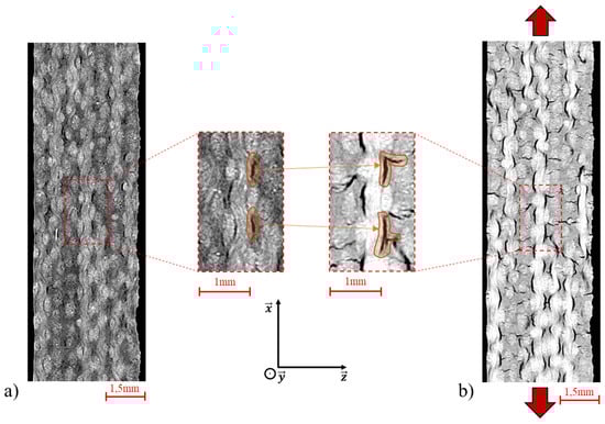 Figure 7 shows examples of micro-CT images in the plane (X,Z), taken at mid-thickness of the in-situ tested sample. The first image has been obtained before loading (Figure 7a) and the second one under loading at 80% of the ultimate stress (Figure 7b). Both zooms in Figure 7 show the same area, before and under loading. As described in Section 3.3, some damage due to the fifteen wet/dry cycles is already visible before loading (Figure 7a). This damage is located around the yarns, at the yarn/matrix interface. When the sample is loaded in tension, some of the debonding extends and leads to matrix cracks. Moreover, some other interfacial damage also appears (Figure 7b).