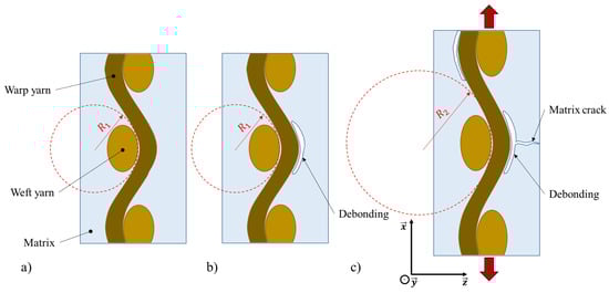 Schemes of the evolution of damage and of the curvature radius of warp yarns (a) before loading and aging, (b) after “15 wet/dry cycles” and before loading, (c) after “15 wet/dry cycles” and under loading.
