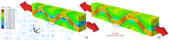 It can be seen in Figure 9 that, apart from the warp yarns themselves, the maximum strain values are systematically localized at the yarn/matrix interfaces; just in the curvature zones (see black circles in Figure 9). These locations correspond exactly with the observations of damage in micro-CT images during the in-situ tensile test (Figure 7 and Figure 8). It explains the formation of debonding in these particular zones. To determine the Young’s modulus value of the modeled material, the reaction forces of all the nodes of the displaced surface were summed and divided by the associated area (Figure 10). The obtained values for both geometries are given in Table 5.