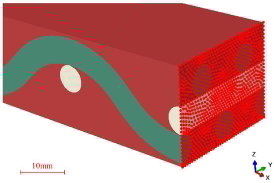 Figure 7 also shows the pronounced waviness of the hemp yarns in the warp direction (along the X-axis). Several curvature radii of the yarns were measured on the micro-CT images, before loading (R1) and under loading (R2). It was observed that the curvature radius is multiplied by two between the unloaded and the loaded states; from about 0.5 mm to 1.0 mm. Figure 8 provides a schematic explanation of the damage and the curvature radius evolution in the tested composite. Before loading and aging, the curvature radius of the warp yarns is equal to R1 and there is no damage (Figure 8a). After the fifteen wet/dry cycles, some debonding at the yarn/matrix interfaces appear and the curvature radius is unchanged (Figure 8b). When the “15 wet/dry cycles” sample is subjected to a tensile loading up to 80% of the ultimate stress, the damage is far more developed, with both debonding and matrix cracks (Figure 8c). The significant development of damage explains the decrease in the modulus observed during ex-situ tensile tests up to about 50% of ultimate stress (Figure 5). Figure 8c also shows the significant increase in the curvature radius of the warp yarns (R2). On another scale, Placet et al. [] demonstrated that the re-alignment of microfibrils leads to the increase in the modulus of a single hemp fiber during tensile testing. Can this explanation be transposed to the composite scale? Is the straightening of the warp yarns the cause of the increase in the modulus of the woven composite? In order to answer this question, a 3D numerical model of the tested composite was created.