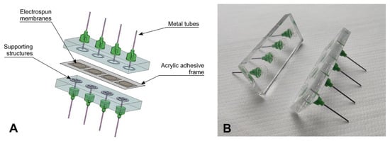 We have developed a custom sectional flow chamber for pumping solutions through electrospun membranes (Figure 1A,B). This flow chamber consists of two parts with a piece of membrane clamped between them. To hold all the parts together, an external metal clamp frame was used. The chamber parts were made of polycarbonate sheets with a thickness of 6 mm. Coaxial 0.8 mm holes were drilled through the sheets opposite each other. Metal tubes with the appropriate outside diameter were fixed in the holes with two-component epoxy resin. We created supporting structures on the surface of one of the plates to hold the membrane against the liquid flow. These structures were made from PET-GAG film (laminated sheet made of amorphous polyethylene terephthalate inner layer and polyethylene terephthalate glycol-modified surface layers on both sides) by cutting with a laser engraving machine (Spirit GLS 100 W CO2) and bonded to the polycarbonate surface using an acrylic film adhesive (3 M 200 MP). On the flow side, the structure was a protruding ring with a diameter of 6 mm to limit the chamber volume above the membrane. On the opposite side, the structure was a supporting grid. These structures served two purposes. First, they prevented the membrane from bending, and second, they ensured an almost uniform flow through the membrane, not just through the central area in front of the metal tube.