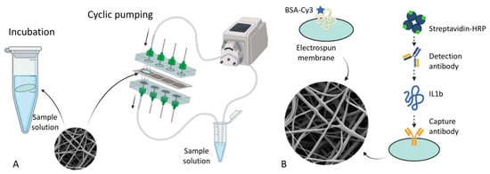 We adopted a commercial IL1b ELISA kit (PSA563Hu01, Cloud-Clone Corp, Wuhan, China) to measure IL1b specific binding onto the electrospun membrane support. Pumping tubings were pre-blocked with 1.5% BSA in PBS for 30 min and then washed with PBST and PBS before membrane loading. Then, the tubes were dried by blowing air, the membranes were fixed, and 350 µL of the capture antibodies solution at 4 µg/mL in PBS was loaded by the cyclic pumping through the membranes for 1 h. The capture antibodies were deposited onto the membranes using the flow-through device for both modes of subsequent analyte loading. This was done to maximize the amount of adsorbed antibodies. After capture antibodies’ immobilization, the membranes were blocked by a 1.5% BSA solution in PBS by cyclic pumping for 30 min, followed by PBST and PBS washing for 15 min.