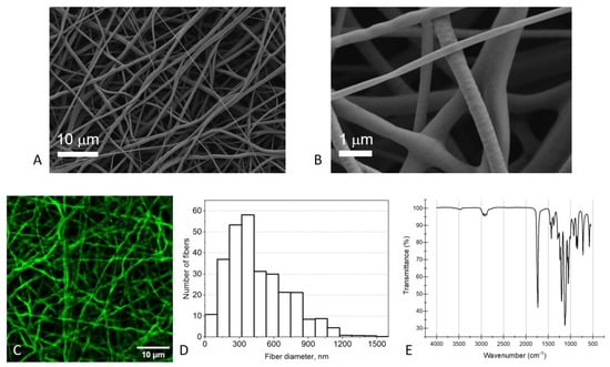 Characterization of the electrospun PDO membranes. (A,B) SEM images, (C) LSCM image (the contrast was enhanced for clarity), (D) distribution of the fiber diameters, obtained by processing eight SEM images, (E) IR spectrum.