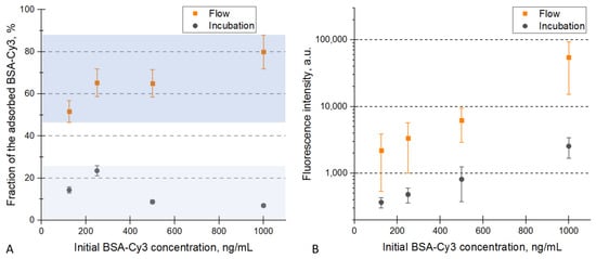 In the current section, we describe experiments with BSA-Cy3 fluorophore covalent conjugates rather than bare BSA protein, which helped to measure its concentration directly (we observed a linear concentration–fluorescence dependence within the studied concentration range). A similar approach is commonly used in studies on adsorption and microfluidics design [,,].