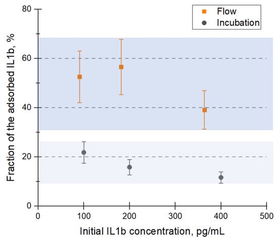 Specific binding of an analyte requires coating the substrate with high-affinity molecules. The monoclonal anti-IL1b antibodies were deposited onto the PDO membranes using cyclic pumping rather than incubation, as it demonstrated superior adsorption efficiency. Then, the membranes were blocked with BSA and divided into two groups—they were used to capture IL1b by incubation or cyclic pumping. Finally, the IL1b solutions after the binding were analyzed for residual amounts of IL1b. This was carried out using ELISA on a 96-well plate (a typical calibration curve is shown in the Supplementary Materials, Figure S3); the fraction of the bound IL1b was calculated for every membrane. The results are shown in Figure 5. The fraction of the captured IL1b was 2.4–3.4-fold higher if the sample was pumped through a membrane. Because the capture antibodies were deposited equally (by cyclic pumping), the observed difference is attributed to the overall efficiency of analyte capture rather than the amount of immobilized antibodies.
