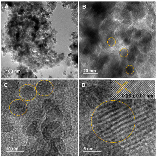 High-resolution transmission electron microscopy (HRTEM) was used to examine the shape and size of synthesized nanoparticles. Ag-doped ZnO agglomerated nanoparticles are shown in Figure 1A–D. These images evidence the nanometric nature (~10 nm) of these crystalline structures with mainly spherical morphology. The lattice spacing for the nanomaterials in the inset (Figure 1D) was about 0.26 ± 0.01 nm, corresponding to the (002) plane of a hexagonal structure [20,21,22]. This average was obtained from ten measurements using the software ImageJ.
