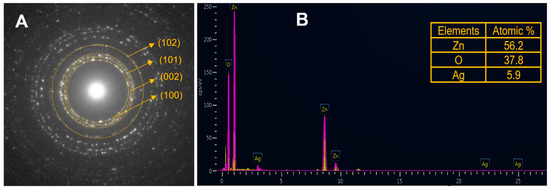 Electron diffraction (ED) patterns (Figure 2A) evidence the high crystallinity of the nanoparticles, and characteristic Miller indexes (100), (002), and (101) suggest a hexagonal wurtzite structure. An elemental composition (Figure 2B) of 56.2% Zn, 37.8% O, and 5.9% Ag for Ag-doped ZnO nanoparticles was confirmed by energy dispersive X-ray spectroscopy (EDX).