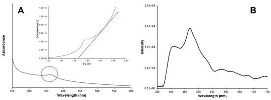 (A) Absorbance spectrum and band gap estimation (inset); (B) Photoluminescence spectrum of non-doped ZnO nanoparticles.