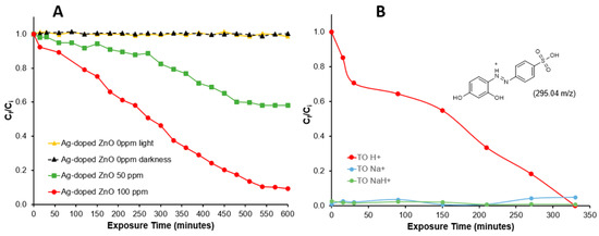 Figure 5A shows the degradation pattern of Tropaeolin O analyzed by absorption at 492 nm using two different concentrations of the Ag-doped ZnO nanocatalyst. The control solution in a dark environment (black line) indicates that none of the Tropaeolin O is adsorbed on the nanocatalyst, and the irradiated control solution (yellow line) confirms the recalcitrant property of the molecule, which is not affected by the UV-irradiation. Azo dyes are synthetic molecules that have high photolytic stability and low biodegradability [43]. The degradation is dependent on the nanocatalyst concentration and irradiation time. Around 58% of the Tropaeolin O was degraded using 50 ppm of the Ag-doped ZnO nanocatalyst, which was increased to 92% using 100 ppm during the first 550 min. In previous studies using 500 ppm of non-doped ZnO nanoparticles, 81% of the destruction of Tropaeolin O was achieved during the first 420 min, and no more degradation was observed after this time [14]. These findings suggest that the presence of silver ions at low concentrations in the ZnO crystals enhances the photocatalytic capacity of these nanoparticles. The results suggests the capacity of the nanocatalyst to produce ROS or interact directly with the Tropaeolin O molecule through the electron–hole pair, producing its degradation. The degradation efficiency of a nanocatalyst can also be explained by the point of zero charge (PZC) of the particle. The PZC is a significant parameter for determining the point where the positive charge and negative charge sites on the surface of the nanoparticles are equal. Based on the synthesis method, ZnO nanoparticles should have basic PZC values (PZC > 7.0) [44]. Tropaeolin O is considered an anionic dye because of the sulfonic group in its structure. This characteristic generates negatively charged tropaeolin O molecules after its dissolution in water with a high affinity to positively charged nanostructures.