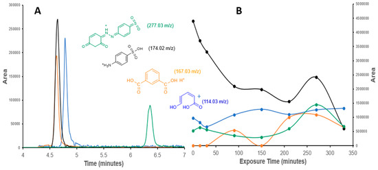 (A) Selected ion chromatograms and (B) photodegradation patterns of the degradation products of Tropaeolin O.