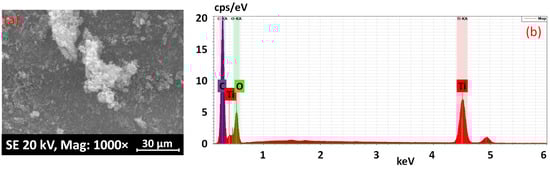 Scanning electron micrograph of titanium dioxide nanoparticles with 1000× magnitude, shown on the (a). The EDX spectrum of the nanoparticles is shown on the (b).