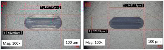 The acquired digital microscope images of the worn disc surfaces with 0 and 0.4 wt% titania concentrations can be observed in Figure 6. The difference can clearly be defined: the addition of titania nanoparticles into the neat Group 3 base oil decreased the width of the wear scar. During a drastic wear process, the usually burned lubricant molecules (dark color on the surface) are removed by the connecting specimen and the worn surface becomes shinier. These shiny wear areas cannot be founded in the wear scars in the case of the titania-added samples, which leads to the deduction that the investigated TiO2 nanoparticle eliminated the establishment of the drastic deep wear grooves since no metal-shining areas can be seen in the wear scar image acquired with 0.4 wt% titania containing nanolubricants.