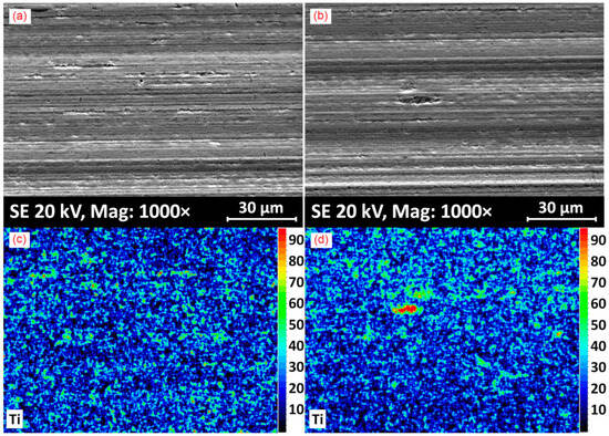 Based on the SEM images (Figure 8a,b), it can be established that the abrasion wear type is dominant on the entire wear track, the grooves of which are visible in the direction of movement. Traces of adhesive wear can be detected in both positions, however, it occurs in a higher proportion in the center of the wear track. EDX is a device suitable only for detecting elements. In the tribology system used during the tests, the titania nano-additive is the only component that contains titanium. Therefore, it can be concluded that all titanium signals entering the detector originate from the titania nano-additive. The figures showing titanium intensity indicate in red the areas from which titanium radiates with a greater intensity. Red areas contain more titanium than green, blue and black areas. Comparing Figure 8a,c, as well as Figure 8b,d, it can be concluded that small amounts of titanium occur uniformly in all areas of the wear track. It is mainly found in significant quantities in the deepest grooves of the wear marks. Based on the images, it can be established that the nano-sized titania additive fills the grooves of the wear track during its operation.