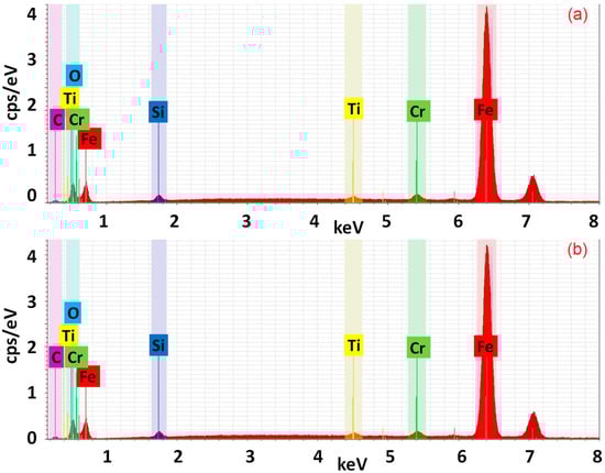 The EDX spectra in Figure 9a,b show similar results; from this, it can be concluded that the elemental composition of the worn surfaces is similar and it is independent of the position. The iron tip is the highest because it provides most of the material of the disc. The primary alloying elements of the disc material are silicon and chromium. Carbon can also be found in the material of the disc, but it was mainly incorporated into the surface from the lubricating oil during the measurement. The origin of the oxygen peak can come from several sources: the disc’s steel material; from surface oxidation; from the titania nano-additive. Since the origin of the oxygen is not clear, it is therefore not suitable for the detection of TiO2. The signal of the titanium peak, marked in yellow in the spectrum, can only come from the presence of the titania additive, so it is used to determine the amount. Based on the intensity of the EDX signals, the titania content of the surface can be calculated; a summary is shown in Table 2.