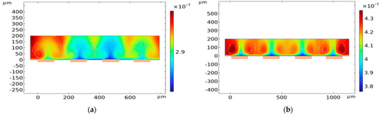 Optimizing the electrode’s design and experimental conditions is crucial for improving responsiveness and overall performance of ACET-enhanced biosensors. One primary approach to enhance the binding efficiency of biosensors without introducing external pumping is to increase the electrothermal force within the sample chamber. Geometric optimization plays a pivotal role in achieving this objective. By carefully designing the channel and electrode geometry, the electrothermal force can be enhanced significantly to promote a binding reaction. To underscore the impact of geometric optimization on enhancing the binding efficiency in ACET-driven reactions, we first consider a scenario where all microchannel parameters remain unchanged except for the widths of the electrodes. In the initial case, the electrode widths are 110 μm, whereas in the subsequent case, they are elongated to 200 μm. The gaps are set to 100 μm. Since the gap distances remain symmetrical, their effects negate each other. Therefore, the primary geometric factor influencing the flow of analytes inside the channel is the width of the electrode. Figure 2 illustrates that this alteration in electrode width distinctly affects the movement of analytes across the sensor surface.