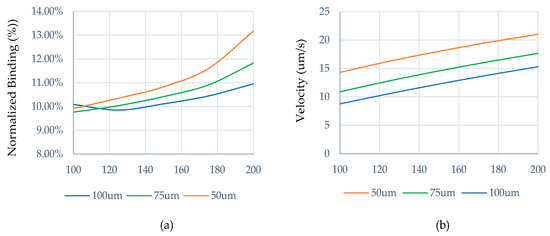 For symmetrical electrode width and gap configuration, (a) normalized binding (%), and (b) velocity.