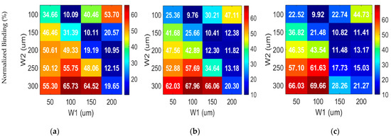 Normalized binding (%) for different electrode configurations at (a) 50 μm, (b) 75 μm, and (c) 100 μm.