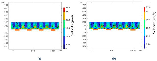 Localized velocity in (μm/s) for (a) symmetrical configuration, and (b) asymmetrical configuration. The asymmetrical configuration distributes more fresh analytes from the top of the channel, resulting in greater binding reaction on top of the electrodes (locations marked in orange).