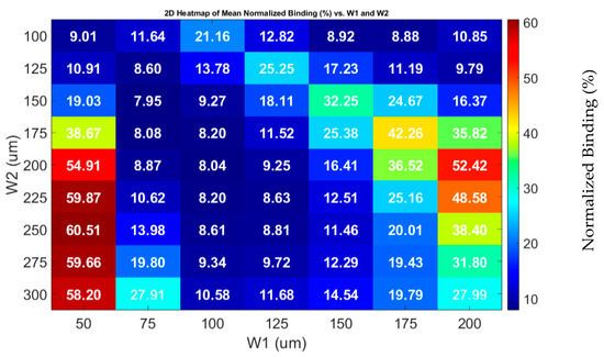 Before going through an exhaustive optimization procedure, an initial endeavor is made to enhance normalized binding by maintaining similar gaps between electrodes G1 and G2. This involves varying W1 within the range of 50 μm to 200 μm, and W2 within the range of 100 μm to 300 μm, across gap distances of 50 μm, 75 μm, and 100 μm. For these different combinations, maximum normalized binding is observed. The primary objective of this experimentation is to examine the impact of field strength in different electrode arrangements, aiming to achieve superior normalized binding compared to the results presented in Figure 3.