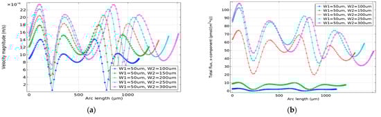 A greater localized velocity indeed facilitates a faster reaction. However, if the analyte distribution happens much faster, due to the lower diffusivity of the analyte, it receives less time to react with the probed electrodes. Conversely, lower localized velocity hinders the refreshment of the sensor surface with fresh analytes. As a result, within a specific timeframe, the binding remains limited. In Figure 7a, the velocity along the length of the micro-channel is plotted for W1 = 50 μm and W2, being varied from 100 μm to 300 μm. As can be seen with respect to the increase in W2, velocity increases and a higher velocity indeed directs the analyte towards the end of the channel much faster. However, if the velocity is considerably lower the molar rate per unit area is affected adversely, which is evident for W2 = 100 μm and 150 μm shown in Figure 7b. On the other hand, if the velocity is much greater due to the lower diffusivity of the analyte, the probes placed on top of the electrode receive less time to react with the analyte, resulting in a lower molar rate per unit area. As a result, the normalized binding for W1:W2 = 50 μm:300 μm is 58.20%, which is slightly lower compared to the normalized binding of 60.51% achieved for W1:W2 = 50 μm:250 μm.