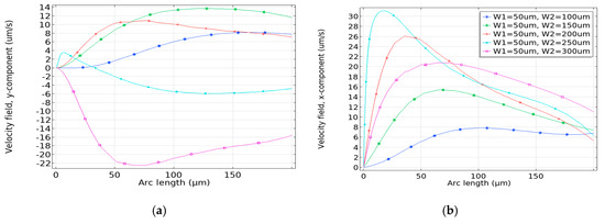 This scenario prompts further investigation to clarify the influence of localized velocity along the channel thickness. The premise is that when the analyte is driven at a significantly higher localized velocity, the analyte becomes predominantly directed toward the channel top (y-axis) before traversing across the channel. Consequently, the directional pumping along the microchannel’s length becomes less prominent, resulting in fewer analytes being bound atop the electrodes. Hence, the pumping along the length of the microchannel is less pronounced, causing fewer analytes to be bound on top of the electrodes. On the other hand, if the velocity x-component is lower along the channel thickness, the analyte on top of the microchannel is toggled less, impeding the refreshment of the sensor surface. To explain this, both x and y components of the velocity along the thickness of the microchannel are observed. The velocity y-component towards the channel thickness is shown in Figure 8a and the result shows that for W2 = 250 μm and W2 = 300 μm, the velocity y-component along the channel height is very low compared to the other W2 configurations. As a result, the effective pumping velocity of the analyte is more distributed along the x-axis for those configurations. Figure 8b shows the velocity x-component along the height of the channel. The result shows that for W2 = 250 μm the velocity x-component is greater compared to other W2 configurations, resulting in more analytes to be distributed from the top of the channel towards the sensor surface. For W2 = 250 μm and 300 μm, the vertical pumping x-component rises to 32 μm/s and 30 μm/s, respectively, and becomes less pronounced as it propagates towards the end of the micro-channel. Hence, more analytes from the top are distributed to the sensor surface.