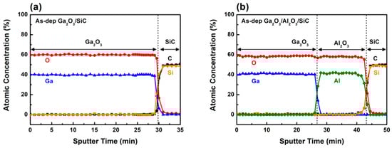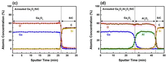 The AES measurements were carried out to obtain a depth profile of Ga, Al, O, Si, and C elements in order to understand their diffusion behaviors at the interface during annealing. Figure 2a–d show depth profiles of the as-deposited and annealed Ga2O3/SiC and Ga2O3/Al2O3/SiC structures. In the Ga2O3/SiC structures (Figure 2a,c), sharp interfaces were observed between the Ga2O3 thin films and SiC substrates. Meanwhile, in the Ga2O3/Al2O3/SiC structures (Figure 2b,d), Al, O, Si, and C atoms had not diffused into the opposite SiC substrates or Al2O3 films. However, gradient changes of Ga and Al atomic concentrations at the Ga2O3/Al2O3 interface indicate the interdiffusion of Ga and Al atoms [23,24]. Therefore, (AlxGa1−x)2O3 ternary compounds at the Ga2O3/Al2O3 interfaces were formed during the annealing of the devices.