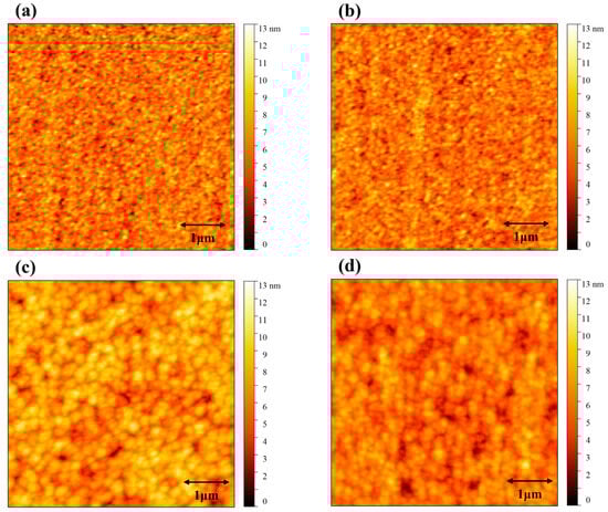 AES depth profiling was conducted using a PHI 710 scanning Auger probe (ULVAC-PHI, Kanagawa, Japan)with electron beam energy of 5 kV, target current of 5 nA, and a SiO2 sputtering rate of 29.4 nm·min−1 to confirm the depth-dependent atomic concentration of the samples. The crystallinity and orientations of the Ga2O3 thin films were examined using XRD (Dmax2500/PC, Rigaku, Tokyo, Japan) by 2θ scanning with CuKα radiation (λ = 0.15406 nm) at 200 mA and 40 kV. Electrical properties of the Ga2O3 thin films, including mobility, charge carrier concentrations, and resistivity, were analyzed by Hall effect measurements (HMS-5000, Ecopia Corporation, Anyang, Republic of Korea). I–V characteristics of the devices were measured by a Keithley 4200-SCS (Cleveland, OH, USA) parameter analyzer. Electrical measurements were carried out on the devices by sweeping the gate-to-source voltage (VGS) from −6 to +2 V and drain-to-source voltage (VDS) from 0 to +10 V.