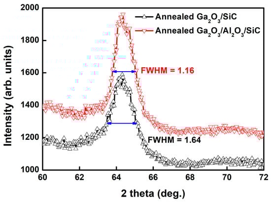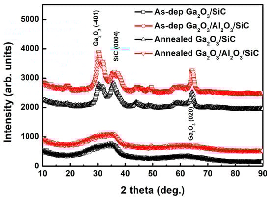 The XRD 2θ–θ patterns at θ of 10–90° of the RF-sputtered Ga2O3 thin films with and without an Al2O3 interlayer are shown in Figure 5. For the as-deposited samples, only strong diffraction peaks of the 4H-SiC (0004) substrates were noted [25,26]. The absence of any Ga2O3 peaks indicates that the as-deposited thin films are in an amorphous state [27]. After annealing at 900 °C, three main peaks were noted at 30.36°, 64.36°, and 35.48°, corresponding to Ga2O3(–401) [28], Ga2O3(020) [9,29], and 4H-SiC(0004), respectively. Furthermore, diffraction peaks of Al2O3 were not observed in the Ga2O3/Al2O3/SiC structure, indicating that the deposited Al2O3 films remained amorphous, even after annealing at 900 °C. This can be attributed to the low annealing temperature in this experiment, which, according to the literature, is too low to cause a phase change from amorphous to crystalline Al2O3 [30]. The presence of the lattice mismatch buffering Al2O3 interlayer, along with any (AlxGa1−x)2O3 formed at the Ga2O3/Al2O3 interface, resulted in enhanced diffraction peak intensities from the (–401) and (020) Ga2O3 crystal faces [14,15,31,32], which may connect to increased crystallite size.