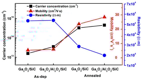 Hall measurements of the Ga2O3 thin films were performed (at room temperature) to examine the influence of annealing and the presence or absence of an Al2O3 interlayer on the electrical properties of the sample devices. Figure 7 shows the carrier concentration, mobility, and resistivity of the different Ga2O3 thin films, according to whether they had been annealed after deposition or not, and relating to the device structure, with or without an Al2O3 interlayer. After annealing of the thin films, the Hall mobility increased, indicating the effect of Ga2O3 crystallization on the Hall mobility. The annealed Ga2O3/Al2O3/SiC devices exhibited the highest charge carrier concentration and mobility (4.52 × 1014 cm−3 and 25.65 cm2 V−1 s−1, respectively) and lowest resistivity (19.86 × 103 Ωm). As previously hypothesized, the improved Hall mobility can be attributed to the larger crystallite size due to the reduction in grain boundary scattering [34,35,36].