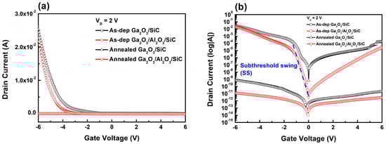 The back-gate transistors, as shown in Figure 1a,b, have a source–drain spacing of 100 μm with highly doped SiC/Ni back gates. Figure 8a,b show the electrical transfer characteristics of the as-deposited and annealed Ga2O3/SiC and Ga2O3/Al2O3/SiC back-gate transistors. The subthreshold swing (SS), defined by the VGS variations required for the ten-fold increase in IDS, is given by the maximum slope in the transfer curve in a logarithmic scale [37] and can be extracted by (Equation (2)):