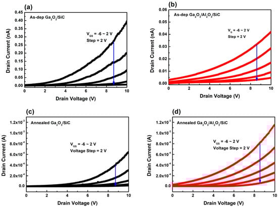 Output characteristics of the as-deposited and annealed (a,c) Ga2O3/SiC and (b,d) Ga2O3/Al2O3/SiC back-gate transistors, respectively.