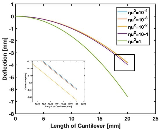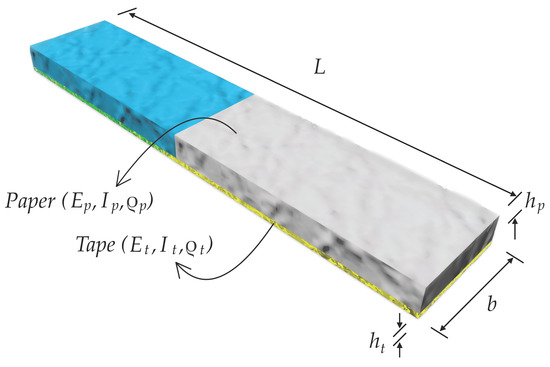 In a bilayer cantilever system with perfectly bonded conditions, the mechanical properties of both layers can be combined to analyze the overall behavior. The flexural rigidity , axial rigidity , and mass density , take into account the contribution of both layers [29,30]. When transitioning from a monolayer to a bilayer system, certain modifications are imperative. For a bilayer setup, in a perfectly bonded condition , , and , are given by , and respectively, for th layer. Given that our B-MaC has a rectangular cross-section as shown in Figure 1, its area can be represented as , where and are respective width and heights. Consequently, for such a rectangular cross-section, the corresponding moment of inertia, can be calculated using the formula for th layer. These modifications highlight the distinct behaviors of monolayer versus bilayer systems and underscore the significance of each parameter in our model. Additionally, stands for the effective strain due to bending and hygro-expansion inherent to the bilayer system obtained via misfit stain [24], and designates the density of the loaded fluid.