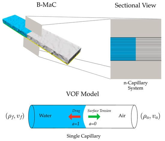 The One-Dimensional N-S equation embodies the conservation of momentum within the fluid, factoring in the influences of advection, pressure gradients, viscous forces, surface tension, and drag forces. In the context of flows far from solid boundaries, drag forces are typically dominating, and the velocity gradients are not at their highest. In these regions, referred to as potential flow regions, viscous effects are negligible compared to the drag forces, and the term representing viscous force per unit mass , can be ignored. This modification emphasizes that the drag forces are the primary concern. By utilizing this in conjunction with the continuity equation for incompressible flow , we can model one-dimensional fluid flow according to the VOF model for capillary flow. Please see Figure 2 for details. This approach mirrors the Lucas–Washburn flow model, leading to the modification of Equation (2) for the wet region ( as follows: