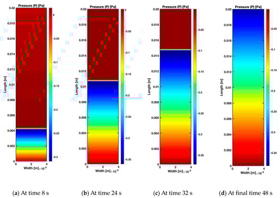 Figure 6 depicts the numerical solution obtained via CFD using the HSMAC method. The plot illustrates the fluid flow profile at times 8 s, 24 s, 32 s, and 48 s. The plot depicts the pressure profiles in both dry and wet regions, capturing the wet–dry interface at the specified time. The model addresses two fluids: water and air, and the adapted Volume of Fluid (VOF) model confines the values of to either 0 or 1. Here, 0 signifies a region that is not wet or where the fluid level has not yet been reached, while 1 indicates a wet region. Since the capillary flow model is utilized and the Lucas–Washburn (LW) equation assumes the wetted length to be 100 percent saturated, the saturation value can only be 0 or 1. The pressure profile delineates the pressure drop across the interface, a linear drop can be identified within the flow in the wet region. In contrast, the dry region exhibits no pressure drop and remains at atmospheric pressure. Obtaining this pressure profile is crucial for verifying the suitability of our model tailored for capillary flow.