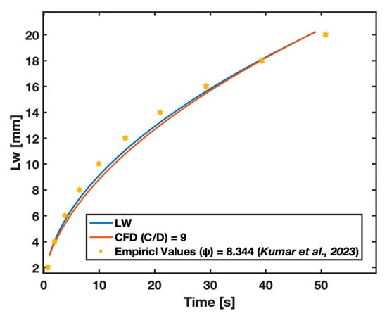 The assessment is more clearly illustrated in Figure 7, showcasing a comparison between the LW (Lucas–Washburn) fluid flow model, CFD results, and empirical values documented in the previous study [24]. Figure 7 plots the wetted length against time . The empirical results, meticulously obtained, are juxtaposed with the model adopted in this study. Using the parameter defined in [24] and , the values derived for the LW model and CFD model are 8.344 and 9, respectively. These values are sufficiently close to confirm that this comparison highlights how the adapted model closely emulates the capillary action, a significant factor in the fluid flow within bilayer actuators in our investigation.