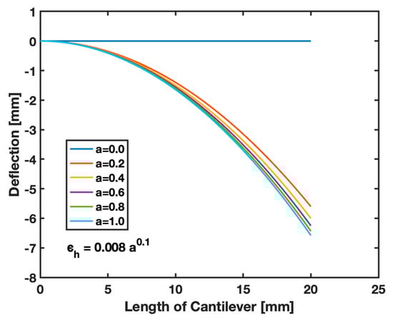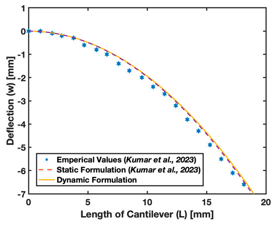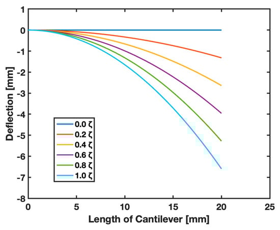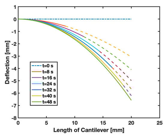 The dynamic response deflection of the bilayer was solved numerically, yielding results that align with our previous research and experimental findings. Figure 8 illustrates the dynamic response deflection for various wetted lengths, and it is essential to recognize that the dynamic effects within this formulation are minimal. This leads us to conclude that the results closely mirror the static formulation as presented in previous studies. While the formulation can be considered static for most cases due to the slight dynamic effect, it is intriguing to discover outcomes that could accommodate different material types. If utilized to construct a bilayer actuator, this formulation could be applied to gauge the response deflection across a broader range of materials.