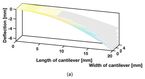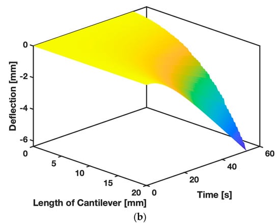 Figure 9a illustrates the response deflection vs. the length and width of the bilayer cantilever, showcasing the dynamic deflection of the B-MaC as the flow progresses from the fixed end to the free end of the cantilever. This 3D plot for the bilayer actuator at various wetted lengths is solved by utilizing a new coordinate approach, obtaining the velocity for each discretized cell, and iteratively solving for the dynamic response deflection of the bilayer actuator. Figure 9b presents a continuous 3D plot for the bilayer actuator under fluidic loading, representing the continuous plot and displaying the overall profile of the 1D beam over the period of loading.