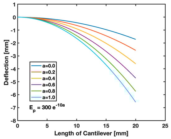 We emphasize the significant changes in the material properties of paper when wetted. Specifically, the modulus of the paper drastically reduces upon fluid imbibition. By treating the paper as isotropic and elastic under certain assumptions [5,24], we can explore the dependency of the modulus of the paper on saturation levels, further detailing how this affects the response deflection of the bilayer actuator. The plots present a greater response deflection for higher saturation content, as the modulus continues to decrease with increasing saturation level. This reduction leads to a decrease in the flexural rigidity of the bilayer actuator. A system with lower flexural rigidity is prone to deform or deflect more for a given amount of load. The results presented in Figure 13 are a clear illustration of this behavior.