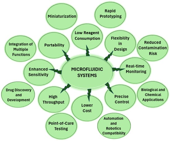 The most basic components required to operate a microfluidic device are microchannels where the flow takes place, input and output ports to the microchannels, a pump that will allow the fluids to flow, and active or passive mixers that will allow them to mix. Apart from these, various internal or external components can be added to the system according to the requirements of the protocol to be applied. For example, valves, filters, micropumps, switches, lenses, membranes, heaters, motors, optical fibers, various other actuators and devices, various sensors for different applications, sealing gaskets, compressed gas lines, micro overpasses to prevent the mixing of liquids, and microflow meters are some of the components that can be used according to needs and purposes [69,70,71,72,73].