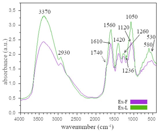From the comparison of the FTIR analysis of Ex-F and Ex-L, it is clear that the absorption bands are similar for both cases. The wide band around the value of 3370 cm−1 (O–H) confirms the presence of alcohol. The absorption bands in the range of 2800–3000 cm−1 are valence and deformation vibrations of C-H bonds in methyl and methylene disorders. The band at 1740 cm−1, which was only observed for Ex-F, corresponds to the valence vibration of the C=O group. This band was also confirmed by other authors [25,26,27] and may be due to the presence of the carbonyl groups of the esters, which may be associated with a double bond or an aromatic ring [28]. The absorption band at 1610 cm−1 is associated with the valence vibrations of C=C groups [29,30], while the absorption band at around 1560 cm−1 may be due to the presence of amide I and amide II, which arise from carbonyl and -N-H valence vibrations in the amide bonds of proteins. The band at 1420 cm−1 corresponds to the C-O-H group. The absorption bands at the wavelength of 1380 cm−1 correspond to C-H vibrations and, as in the case of the bands in the range of 2800–3000 cm−1, were caused by valence and deformational vibrations of C-H bonds in methyl and methylene groups [30]. The absorption band at the wavelength around 1236 cm−1 and the band around 1120 cm−1 can be assigned to the C-O valence vibration of the ester group [26,27]. The absorption band that appeared in the spectra at the wavelength of around 1050 cm−1 is related to the C-O bond. The bands at 580 and 530 cm−1 were caused by alkyl halides, which are found in flavonoids.