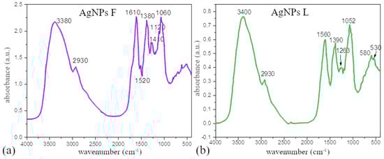 FTIR spectra of AgNPs colloids prepared using (a) Ex-F and (b) Ex-L.