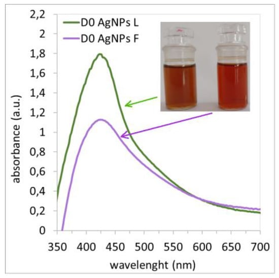 UV-vis absorption spectra of synthesized AgNPs (day 0) prepared using lavender flower (D0 AgNPs F) and leaf (D0 AgNPs L) extracts.