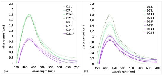 Another important property is the stability of nanoparticles, which depends on several factors, such as the presence of stabilizing substances in the extracts and storage conditions (RT, cold temperatures, etc.). The stability of the AgNPs in colloidal solution for the samples stored at room temperature and in a refrigerator (F-RT, F-Cold, L-RT, and L-Cold) was monitored over 21 days (Figure 5).