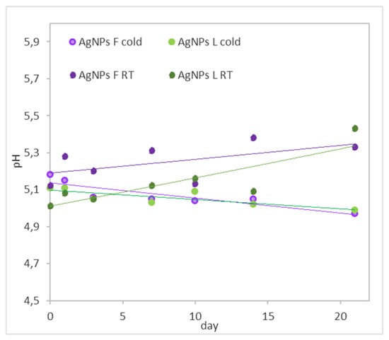 For all the colloidal solutions stored in a refrigerator and at room temperature, the pH was measured over 21 days (Figure 6). The colloidal solutions stored at room temperature have larger deviations, and, in general, their pH values increased. In the case of the colloids stored in the cold, the pH did not change significantly, which means that the extracts, due to their composition, provide a suitable and stable environment. Silver nanoparticles are well known for being sensitive to light. We assume that this factor causes their degradation, which is reflected in the increase in pH values.