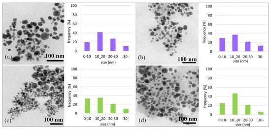 Figure 7b,d show the TEM microphotographs of the AgNPs stored in cold conditions, i.e., in a refrigerator. After 21 days, the shapes of the nanoparticles did not change. A slight change in the number of nanoparticles with a size of up to 20 nm (from 75% to 80% in the case of Ex-L and from 60% to 69% for Ex-F) was observed; such changes are not significant. The difference in the size distribution results could be due to statistical variation in the measurement of the distribution.