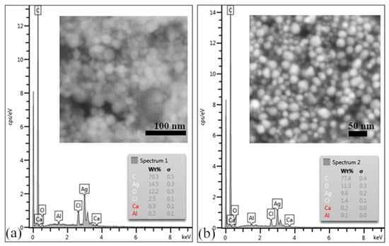 Analysis via scanning electron microscopy confirmed the presence of uniform, almost-spherical AgNPs, as shown in Figure 8a,b. EDX analysis, the results of which are shown in Figure 8a,b, confirmed the presence of silver and demonstrated the presence of signals of accompanying elements such as C, Cl, O, and Ca. These elements probably came from the biological component of the extract, which could be removed by washing the samples more thoroughly with ethanol.