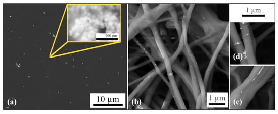 (a) SEM image of a thin film with AgNPs L; the inner picture shows SEM microstructures of AgNPs prepared using Ex-L. (b) SEM image of fibers with AgNPs L. (c) Details of AgNPs in fibers. (d) Details of AgNPs on fibers.