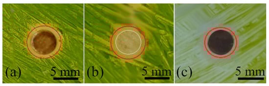 Antibiofilm activity was monitored for 14 days. Lavender flower and leaf extracts were applied, and AgNO3 stock solution was used as a control. The extracts themselves, shown in Figure 10b,d, and AgNO3 did not show any inhibition zones during the 14 days of observation.