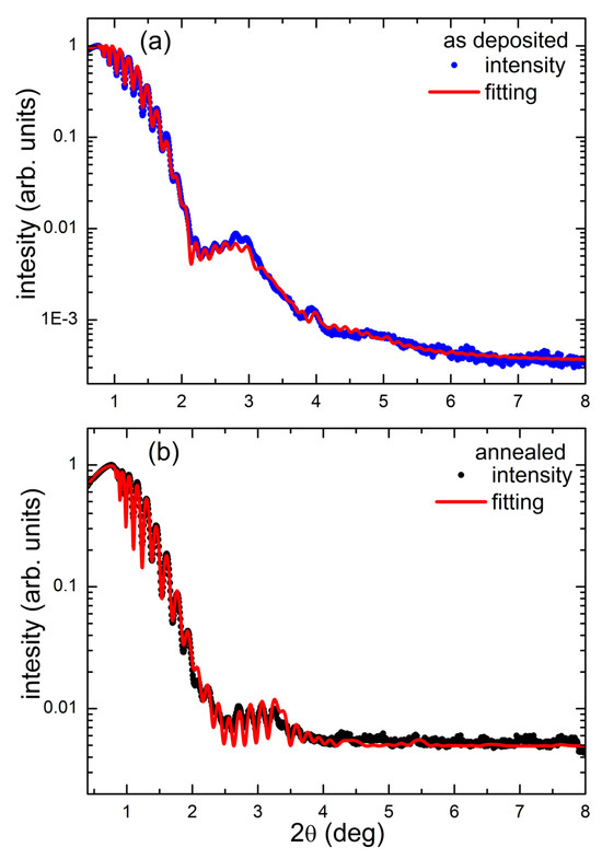 XRR patterns for a Ni/NiO/Pt multilayer (data points) in (a) the as-deposited state and (b) after annealing. The fitted patterns using the GenX code are also shown (continuous lines).